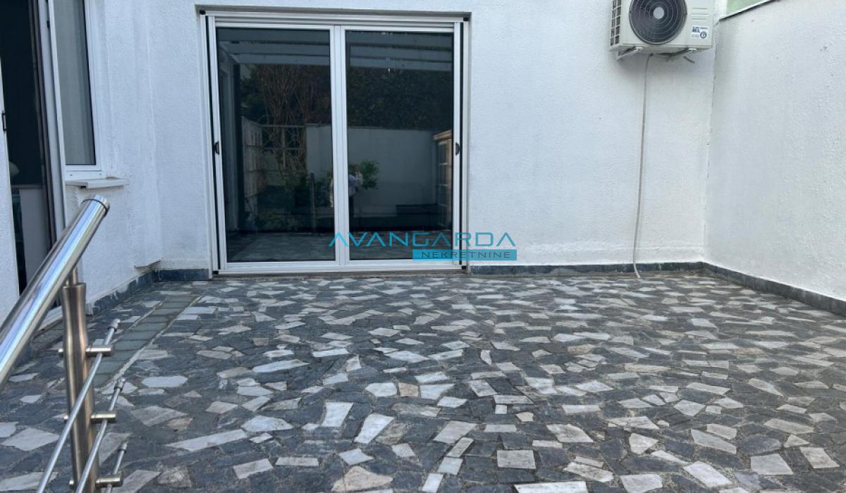 U nivou prizemlja je velika terasa koja je ograđena sa malom bašticom. Kuća poseduje i malu šupu u ograđenom delu pogodnu za ostavljanje bicikala i baštenskih predmeta.